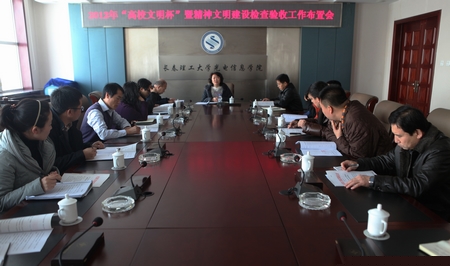 黨群工作部部長朱庚新傳達了學院《關于2012年度“高校文明杯”競賽活動暨精神文明建設工作檢查驗收的通知》,對檢查的重點工作做了說明,介紹了迎接檢查的具體工作安排,并對各單位迎檢工作進行了明確分工。