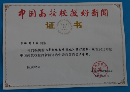 7月2日,2012年度中國(guó)高校校報(bào)好新聞評(píng)選結(jié)果揭曉,我院新聞中心李琢、大學(xué)生記者團(tuán)劉自豪師生編輯的《光電信息學(xué)院報(bào)》2012年第47期第一版面,在2012年度中國(guó)高校校報(bào)好新聞評(píng)選中榮獲版面類(lèi)三等獎(jiǎng)。中國(guó)高校校報(bào)好新聞獎(jiǎng)是全國(guó)高校校報(bào)年度優(yōu)秀新聞作品最高獎(jiǎng)項(xiàng)。