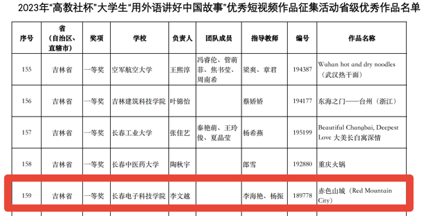 近日,由全國高等學校大學外語教學研究會指導,南京大學主辦,高等教育出版社協(xié)辦的第二屆“高教社杯”大學生“用外語講好中國故事”優(yōu)秀短視頻作品征集活動評審結果揭曉,我校通識教育學院李海艷老師和楊振老師指導的學生李文越制作的《赤色山城》(Red Mountain City)短視頻作品榮獲吉林省一等獎。