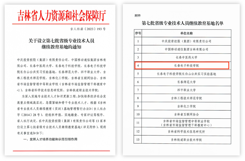 近日,吉林省人力資源和社會(huì)保障廳印發(fā)《關(guān)于設(shè)立第七批省級(jí)專業(yè)技術(shù)人才繼續(xù)教育基地的通知》(吉人社函〔2023〕193號(hào)),長(zhǎng)春電子科技學(xué)院從省內(nèi)眾多高校和機(jī)構(gòu)中脫穎而出,成功獲批吉林省專業(yè)技術(shù)人才繼續(xù)教育基地。此次獲批是吉林省人社廳對(duì)我校繼續(xù)教育工作的充分肯定,基地將依托我校優(yōu)質(zhì)高等教育與培訓(xùn)資源,由我校繼續(xù)教育學(xué)院具體實(shí)施,面向社會(huì)開展專業(yè)技術(shù)人員繼續(xù)教育。