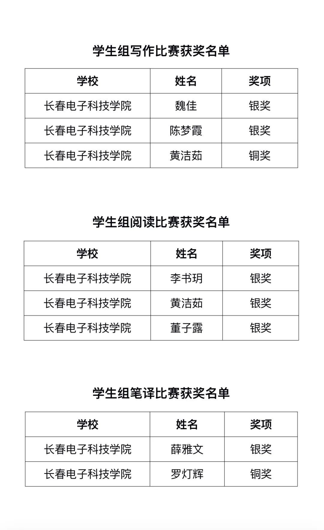 近日,2023“外研社?國才杯”“理解當代中國”外語能力大賽吉林省賽區(qū)決賽圓滿結束。我校參賽學生在通識教育學院教師們的精心指導下,憑借自身的綜合素質和較好的英語水平,在比賽中取得了出色成績。其中,魏佳和陳夢霞同學獲得寫作賽項銀獎,黃潔茹同學獲得寫作賽項銅獎,李書玥、黃潔茹和董子露同學獲得閱讀賽項銀獎,薛雅文和羅燈輝同學分別獲得筆譯賽項銀獎和銅獎。