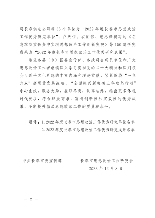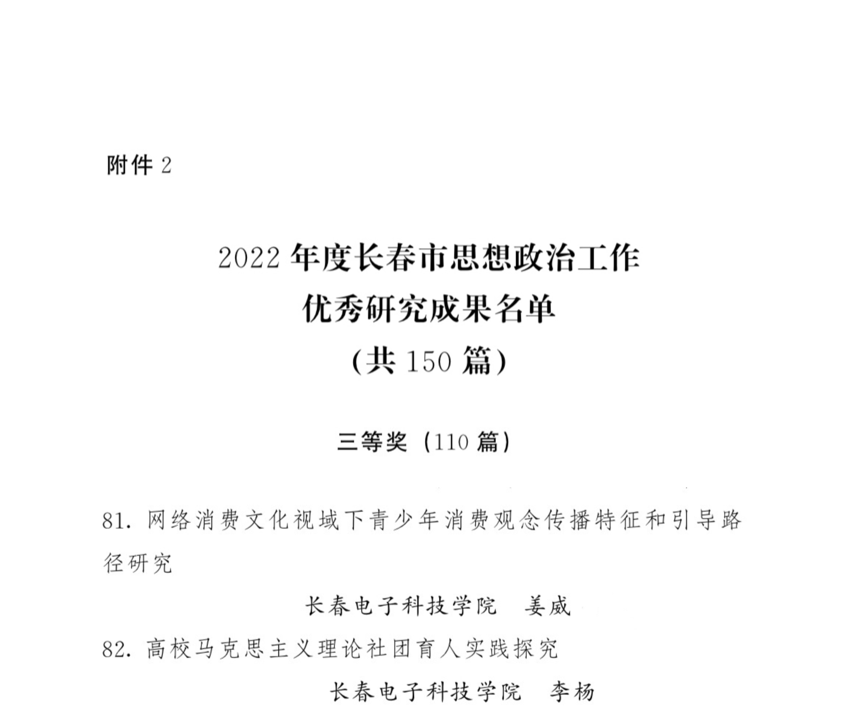 近日,中共長春市委宣傳部、長春市思想政治工作研究會聯(lián)合下發(fā)了《關(guān)于表彰2022年度長春市思想政治工作優(yōu)秀研究單位和優(yōu)秀研究成果的決定》,我校榮獲“長春市思想政治工作優(yōu)秀研究單位”稱號,我校姜威撰寫的《網(wǎng)絡(luò)消費(fèi)文化視域下青少年消費(fèi)觀念傳播特征和引導(dǎo)路徑研究》、李楊撰寫的《高校馬克思主義理論社團(tuán)育人實(shí)踐探究》分別獲得“長春市思想政治工作優(yōu)秀研究成果”三等獎。