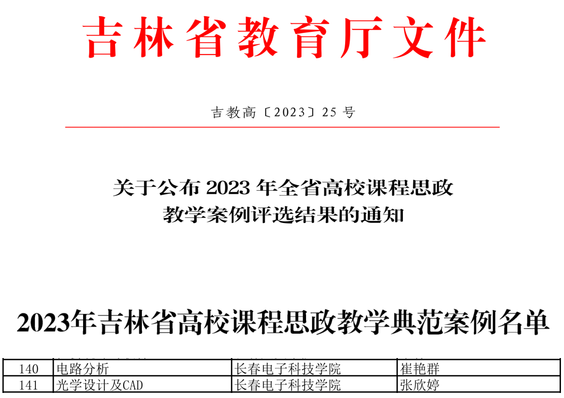 我校教務(wù)處高度重視此次活動(dòng),積極響應(yīng),按照《關(guān)于開(kāi)展我校課程思政教學(xué)案例評(píng)選與展示交流活動(dòng)的通知》組織全校教師開(kāi)展此次活動(dòng)。經(jīng)過(guò)學(xué)校推選,省級(jí)評(píng)審,最終崔艷群老師的《電路分析》、張欣婷老師的《光學(xué)設(shè)計(jì)及CAD》課程榮獲2023年吉林省高校課程思政教學(xué)典范案例。