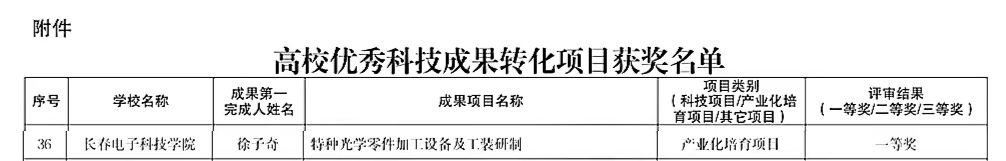 學(xué)??蒲刑幐叨戎匾暣舜喂ぷ鳎e極組織全校教師申報(bào),經(jīng)學(xué)校推選,省級(jí)評(píng)審,最終徐子奇老師的吉林省教育廳項(xiàng)目《特種光學(xué)零件加工設(shè)備及工裝研制》榮獲產(chǎn)業(yè)化培育項(xiàng)目一等獎(jiǎng);劉春艷老師的長(zhǎng)春市科技局項(xiàng)目《汽車人數(shù)據(jù)采集與分析系統(tǒng)》和徐子奇老師的吉林省科技廳項(xiàng)目《光學(xué)級(jí)高分體SiC/AI超薄反射鏡加工關(guān)鍵技術(shù)研究》兩項(xiàng)項(xiàng)目榮獲科技項(xiàng)目二等獎(jiǎng)。