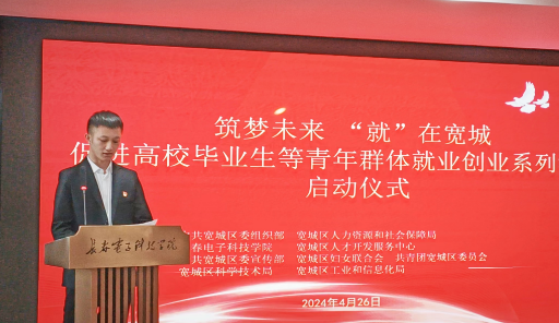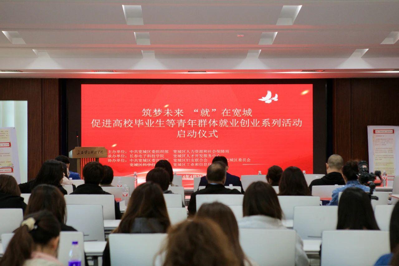 為深入貫徹落實(shí)習(xí)近平總書記關(guān)于以人口高質(zhì)量發(fā)展支撐東北全面振興等系列重要指示精神,吸引高校畢業(yè)生留聚寬城就業(yè)創(chuàng)業(yè),宣傳落實(shí)省、市高校畢業(yè)生就業(yè)創(chuàng)業(yè)工作決策部署,4月26日上午,由寬城區(qū)人才服務(wù)中心主辦、長春電子科技學(xué)院承辦的筑夢未來“就”在寬城促進(jìn)高校畢業(yè)生等青年群體就業(yè)創(chuàng)業(yè)系列活動(dòng)儀式成功啟動(dòng)。長春市人才服務(wù)中心副主任、組織部、宣傳部、區(qū)婦聯(lián)、團(tuán)區(qū)委、人社局、科技局、工信局、各街道、開發(fā)區(qū)(蘭家鎮(zhèn))、區(qū)內(nèi)院校、駐區(qū)企業(yè)代表參加此次活動(dòng),會(huì)議由我校就業(yè)創(chuàng)業(yè)指導(dǎo)中心張丹主持。
