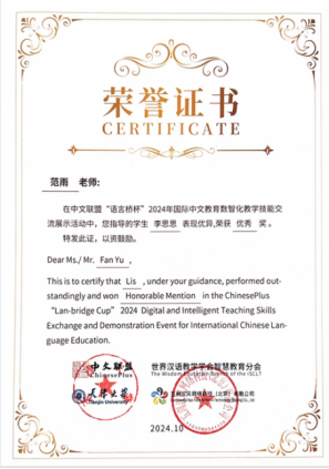 近日,“中文聯(lián)盟‘語言橋杯’2024年國(guó)際中文教育數(shù)智化教學(xué)技能交流展示”活動(dòng)在天津大學(xué)成功舉辦。我校文化傳媒學(xué)院漢語國(guó)際教育專業(yè)的孔晨曦、李思思兩位同學(xué)以出色表現(xiàn)榮獲全國(guó)優(yōu)秀獎(jiǎng)。