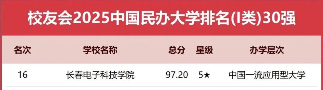 建校以來(lái),學(xué)校先后獲得“全國(guó)優(yōu)秀民辦高等教育學(xué)校”“吉林省文明校園”“吉林省依法治校示范校”“長(zhǎng)春市精神文明建設(shè)先進(jìn)單位”等榮譽(yù)稱(chēng)號(hào)。2024年學(xué)校位列軟科中國(guó)民辦高校排名(主榜)第39位,位列艾瑞深校友會(huì)排行榜全國(guó)民辦大學(xué)(Ⅰ類(lèi))第16位,被評(píng)為“中國(guó)一流應(yīng)用型大學(xué)”。