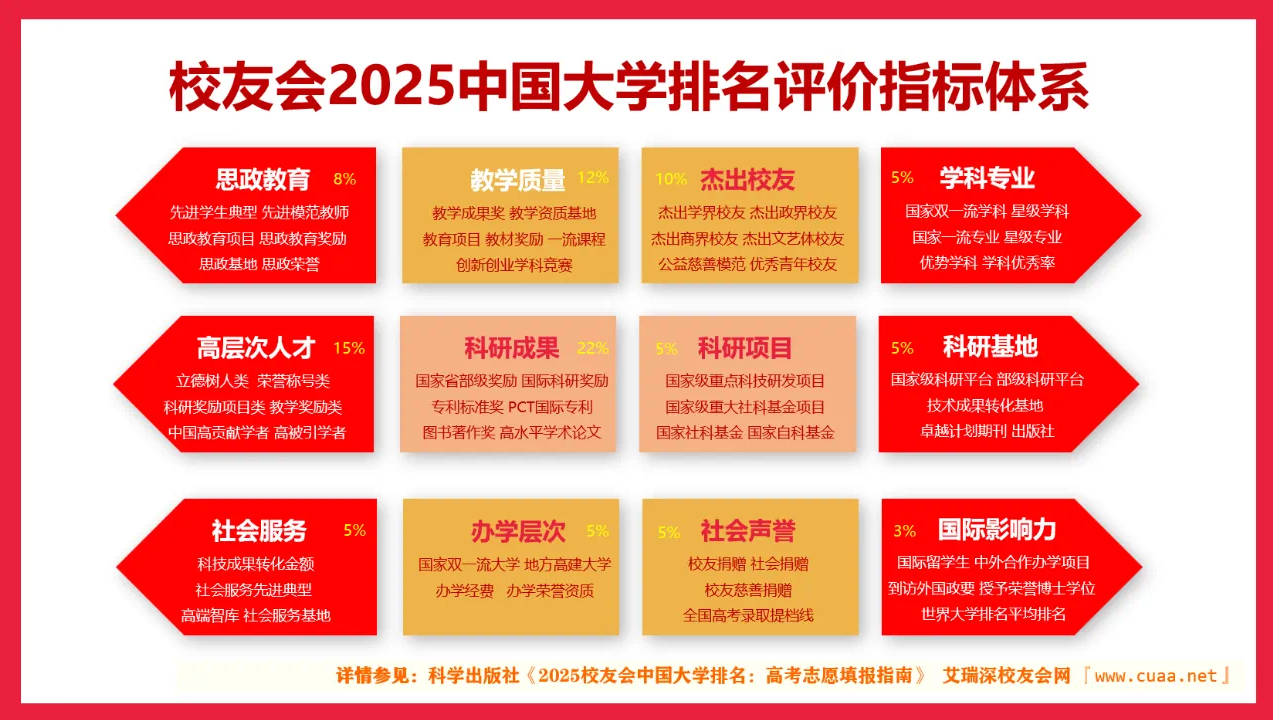 校友會(huì)中國(guó)大學(xué)排名首發(fā)于2003年,至今已有23年的歷史,已成為具有廣泛社會(huì)影響力、公信力、參考價(jià)值與創(chuàng)新力的中國(guó)大學(xué)排名領(lǐng)先品牌。校友會(huì)2025中國(guó)大學(xué)排名評(píng)價(jià)院校涵蓋我國(guó)海峽兩岸暨香港澳門(mén)地區(qū)的2000多所公辦本科大學(xué)、民辦大學(xué)(含獨(dú)立學(xué)院)、中外合作辦學(xué)大學(xué)、職業(yè)技術(shù)大學(xué)和高職(專(zhuān)科)院校等高校。