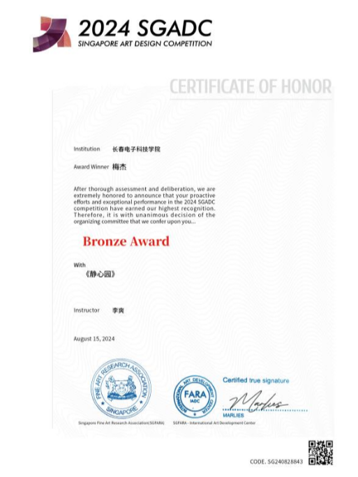 近日,2024新加坡金沙藝術(shù)設(shè)計(jì)大賽獲獎(jiǎng)名單揭曉。我校文化傳媒學(xué)院環(huán)境設(shè)計(jì)專業(yè)梅杰同學(xué)在李爽副教授指導(dǎo)下,憑借作品《靜心園》從全球11026件參賽作品中脫穎而出,斬獲環(huán)境設(shè)計(jì)類銅獎(jiǎng),李爽副教授獲評(píng)“優(yōu)秀指導(dǎo)教師獎(jiǎng)”,此次獲獎(jiǎng)標(biāo)志著環(huán)境設(shè)計(jì)專業(yè)國(guó)際化教學(xué)取得新成果。