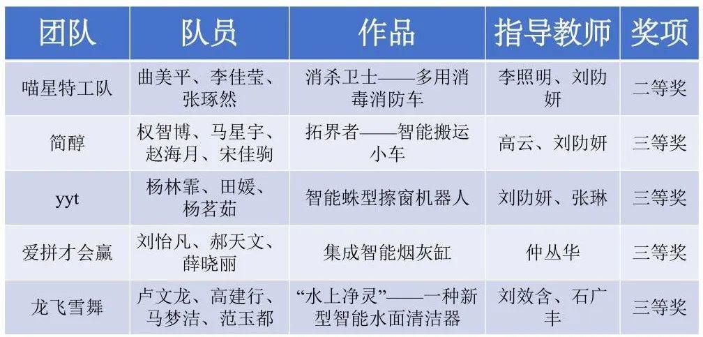 學校高度重視此次賽事,積極組織學生參賽,共選派多支隊伍參與角逐。最終照明和劉阞妍老師指導的“消殺衛(wèi)士——多用消毒消防車”獲得大賽二等獎;高云和劉阞妍老師指導的“拓界者——智能搬運小車”、劉阞妍和張琳老師指導的“智能蛛型擦窗機器人”、仲叢華老師指導的“集成智能煙灰缸”、石廣豐和劉效含老師指導的“‘水上凈靈’——一種新型智能水面清潔器”獲得三等獎。