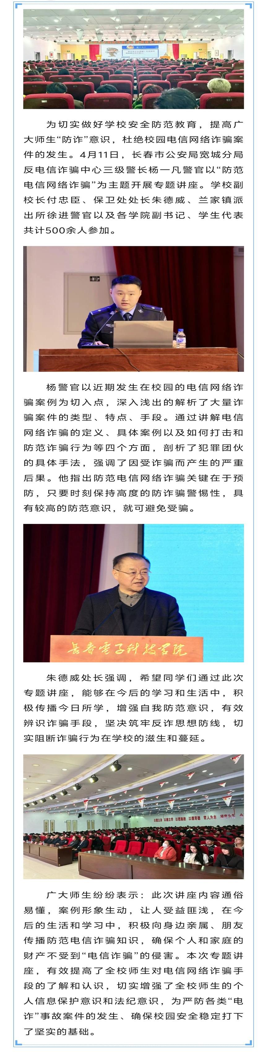 為切實(shí)做好學(xué)校安全防范教育,提高廣大師生防詐意識,杜絕校園電信網(wǎng)絡(luò)詐騙案件的發(fā)生。4月11日,長春市公安局寬城分局反電信詐騙中心三級警長楊一凡警官以防范電信網(wǎng)絡(luò)詐騙為...