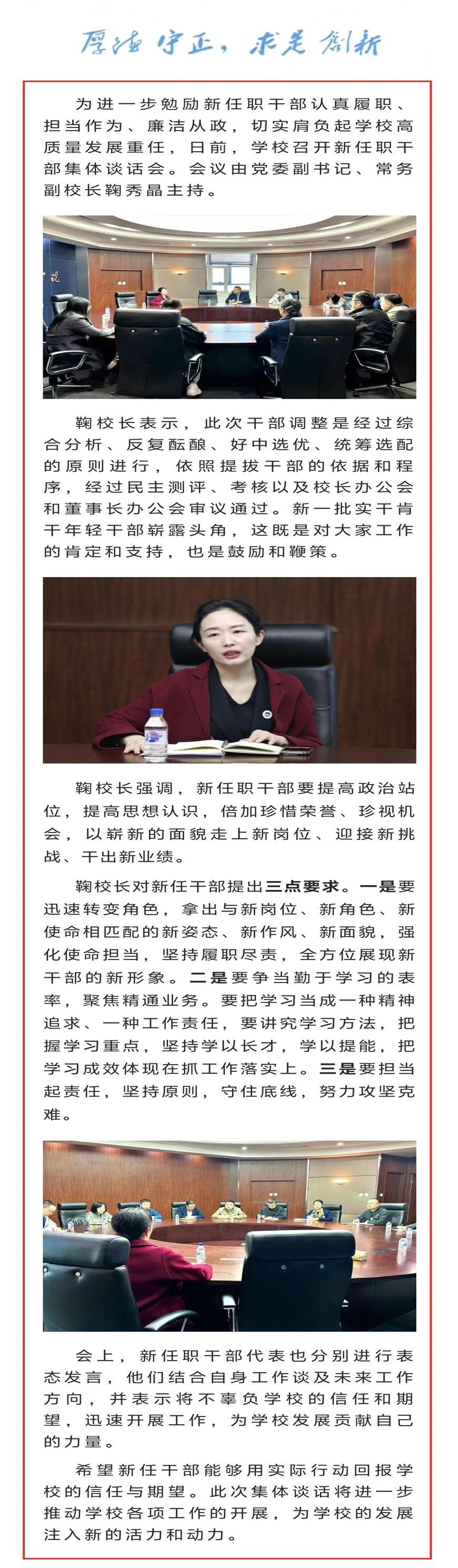 為進(jìn)一步勉勵新任職干部認(rèn)真履職、擔(dān)當(dāng)作為、廉潔從政,切實(shí)肩負(fù)起學(xué)校高質(zhì)量發(fā)展重任,日前,學(xué)校召開新任職干部集體談話會。會議由黨委副書記、常務(wù)副校長鞠秀晶主持。 鞠校...