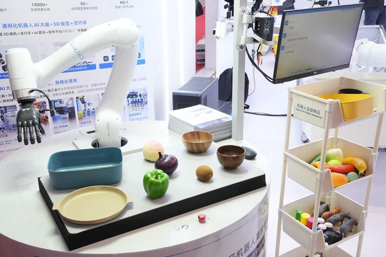 在長春電子科技學(xué)院展臺,工作人員正在展示梅卡曼德機(jī)器人的功能,只需要用語音對它發(fā)出指令,它就能在無規(guī)則放置的物體模型中,自動識別出需要抓取的物體并精準(zhǔn)放到指定位置。