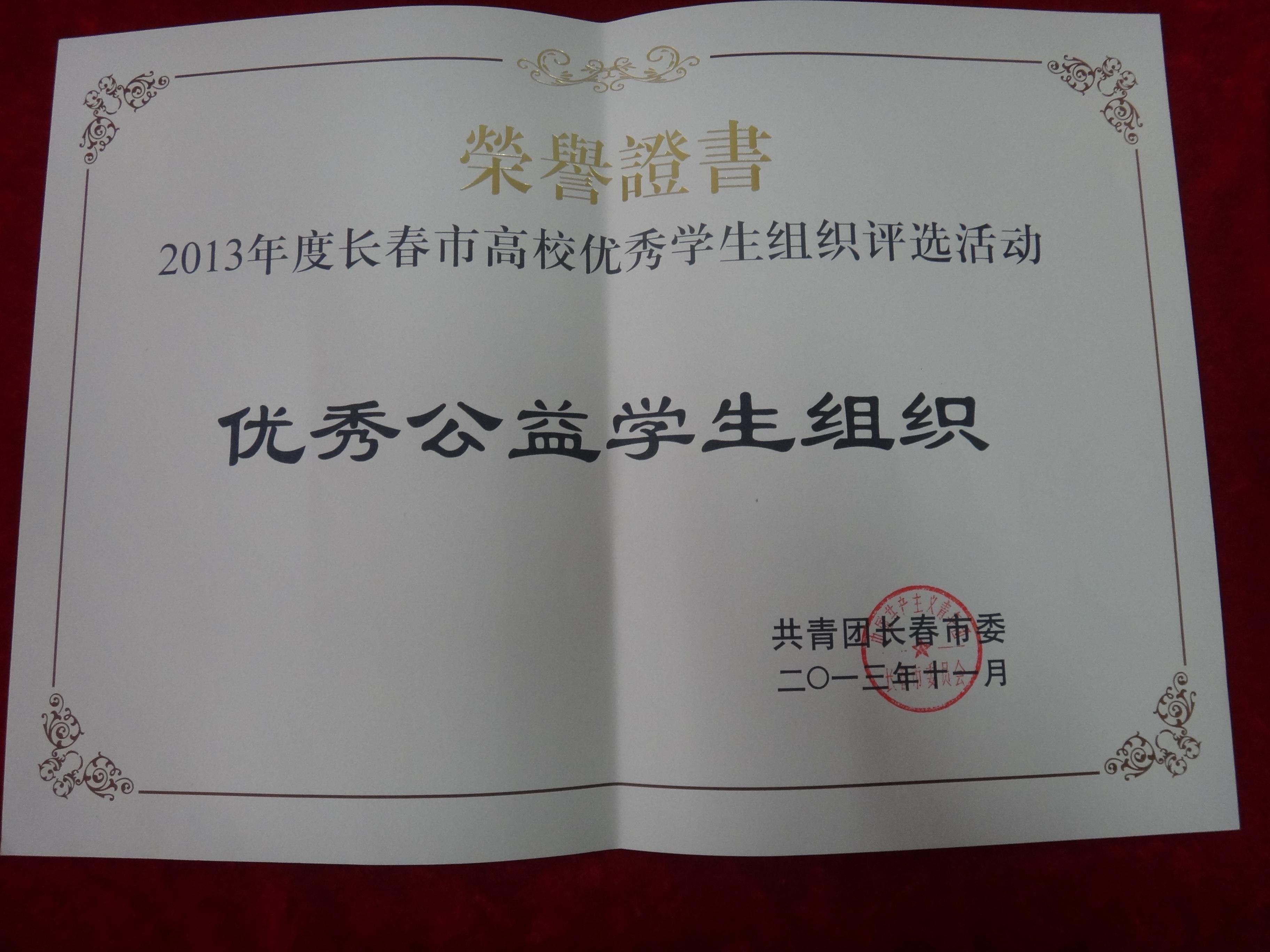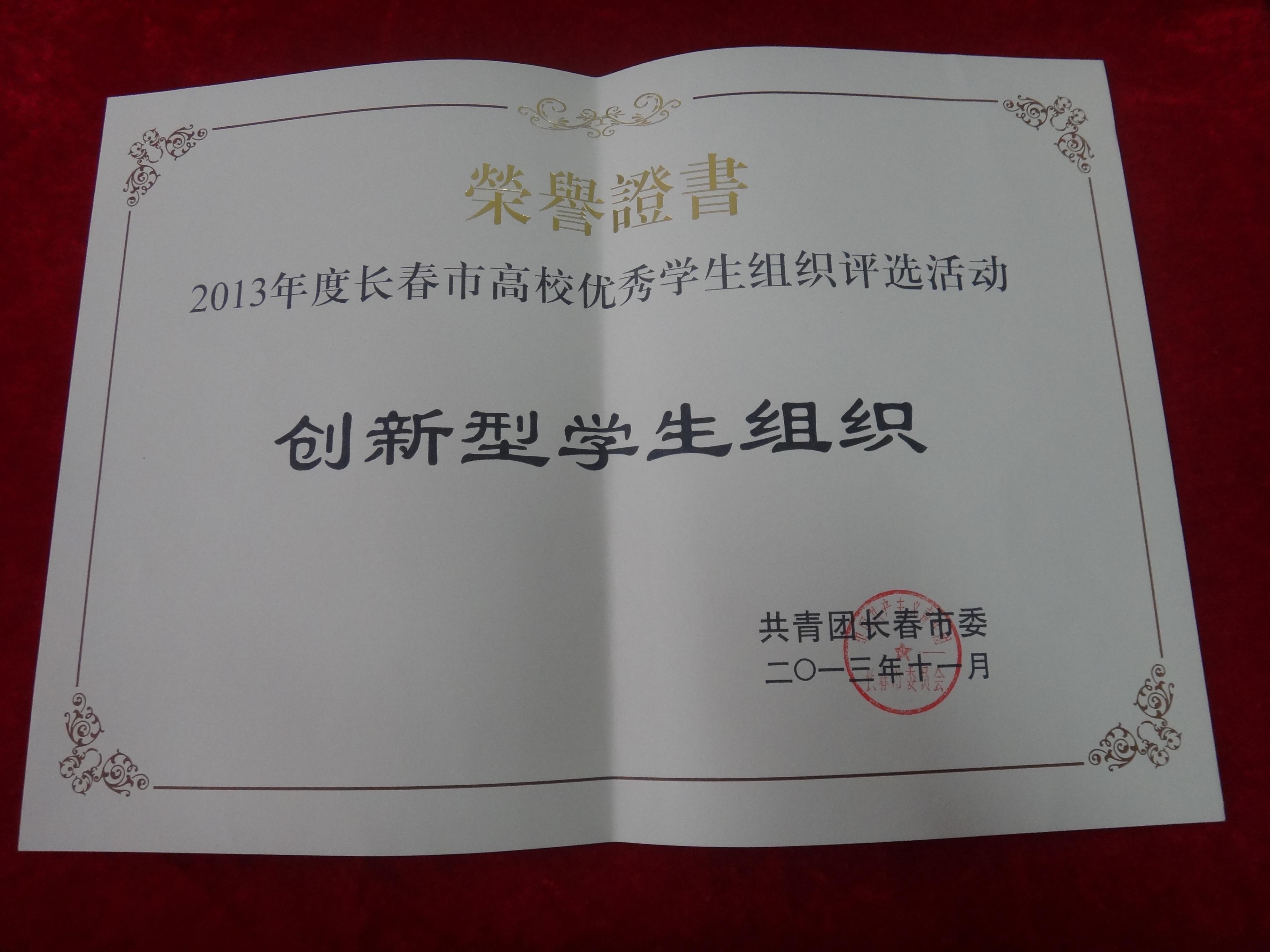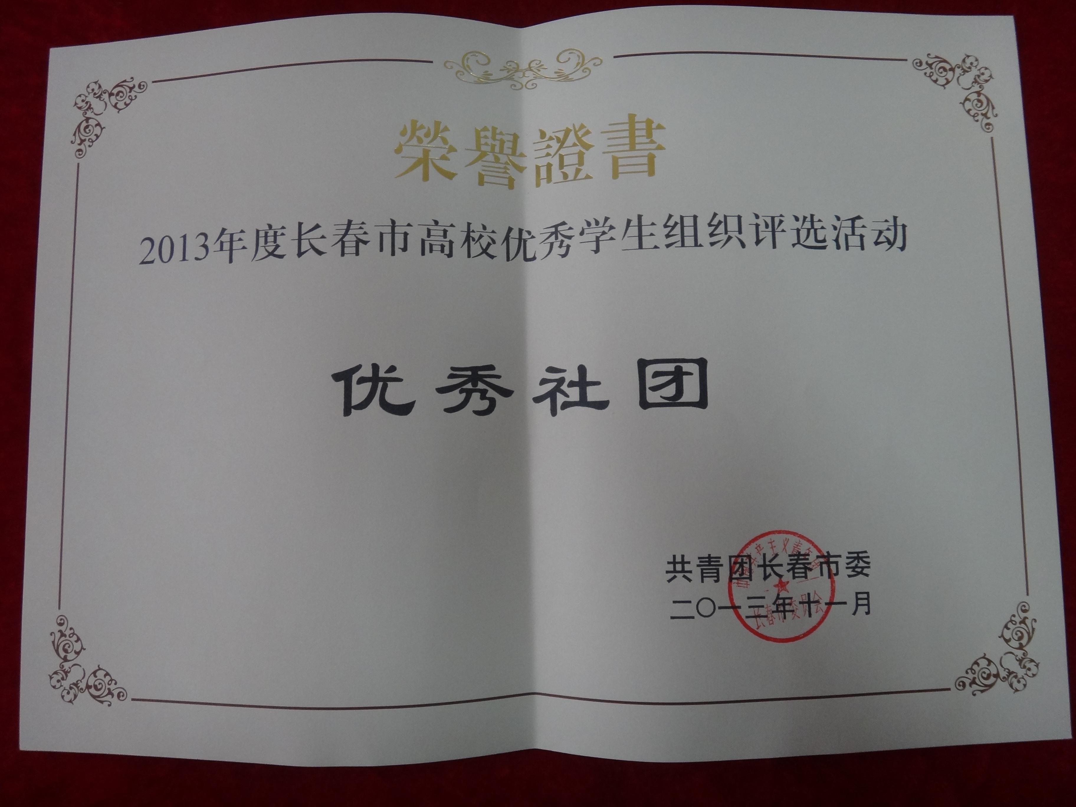 我院社團聯(lián)合會被授予“2013年度長春市高校優(yōu)秀學(xué)生組織評選活動優(yōu)秀社團聯(lián)合會”的榮譽稱號。此次評選輪滑協(xié)會和吉他指彈協(xié)會還被授予“2013年度長春市高校優(yōu)秀學(xué)生組織評選活動優(yōu)秀社團”的榮譽稱號,心語志愿者協(xié)會被授予“2013年度長春市高校優(yōu)秀學(xué)生組織評選活動優(yōu)秀公益型學(xué)生組織”的榮譽稱號,諾恩斯漫動漫協(xié)會和偵探推理協(xié)會均獲得“2013年度長春市高校優(yōu)秀學(xué)生組織創(chuàng)新型學(xué)生組織”的榮譽稱號。