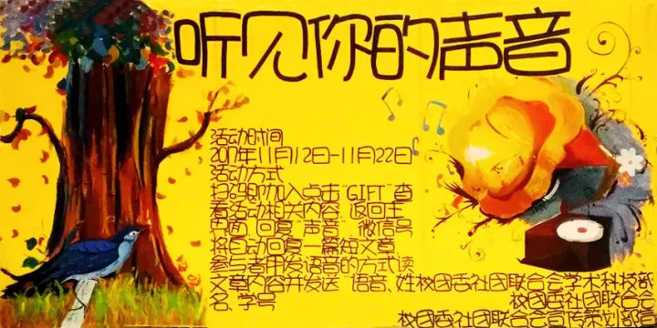 如果你是一個(gè)喜歡用自己聲音訴說(shuō)故事的人,如果你是一個(gè)擁有著令人陶醉的迷人嗓音的人,那么來(lái)參加團(tuán)委社團(tuán)聯(lián)合會(huì)學(xué)術(shù)科技部舉辦的“聽(tīng)見(jiàn)你的聲音”活動(dòng)吧,展現(xiàn)你的聲音,用你動(dòng)人的聲音打動(dòng)我們。