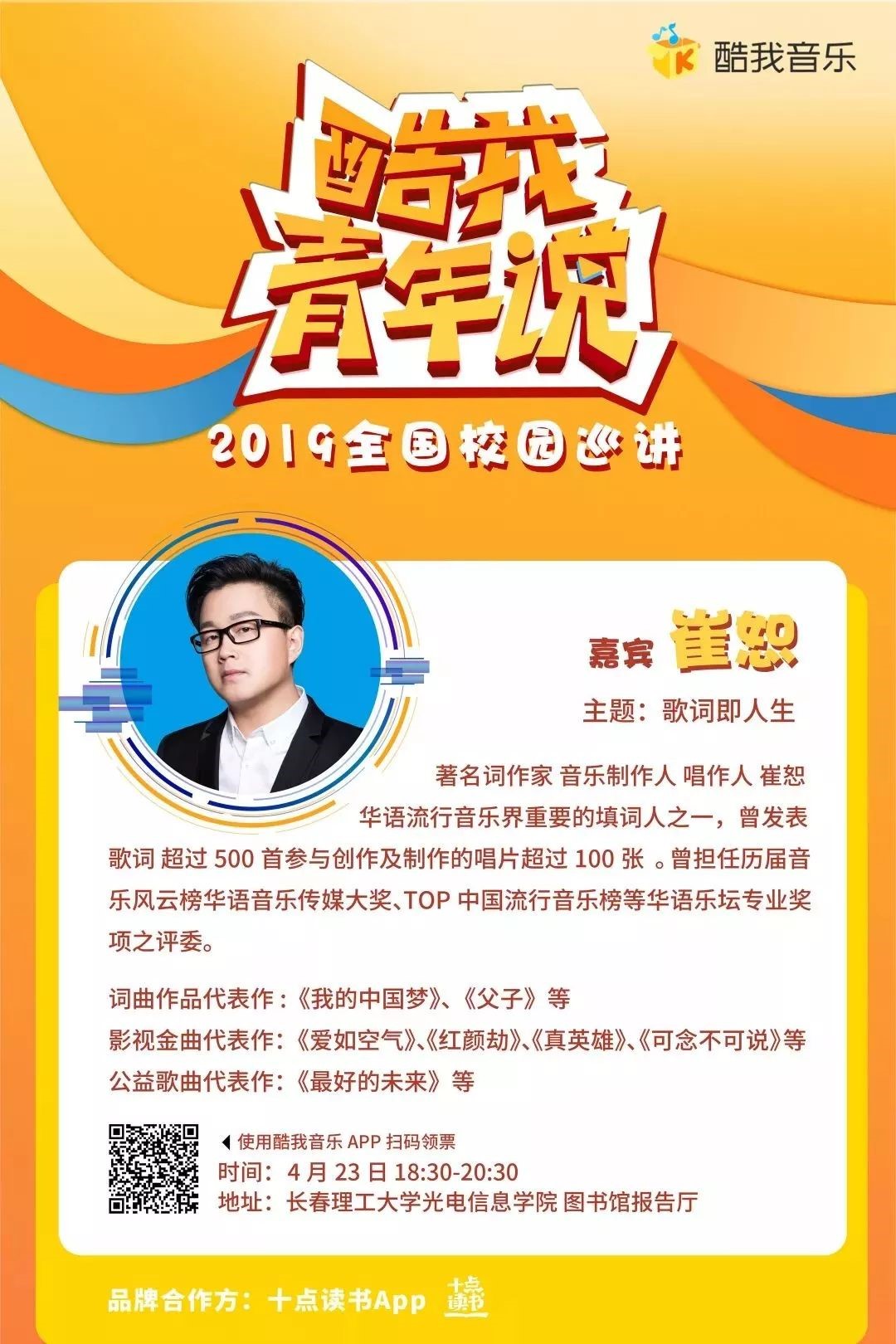 為響應(yīng)教育部所提出的“高校美育工作”理念,由酷我音樂(lè)傾情打造的《酷我青年說(shuō)》全國(guó)校園巡講-著名音樂(lè)制作人崔恕在長(zhǎng)春理工大學(xué)光電信息學(xué)院專場(chǎng),將于4月23日在圖書(shū)館報(bào)告廳舉行。