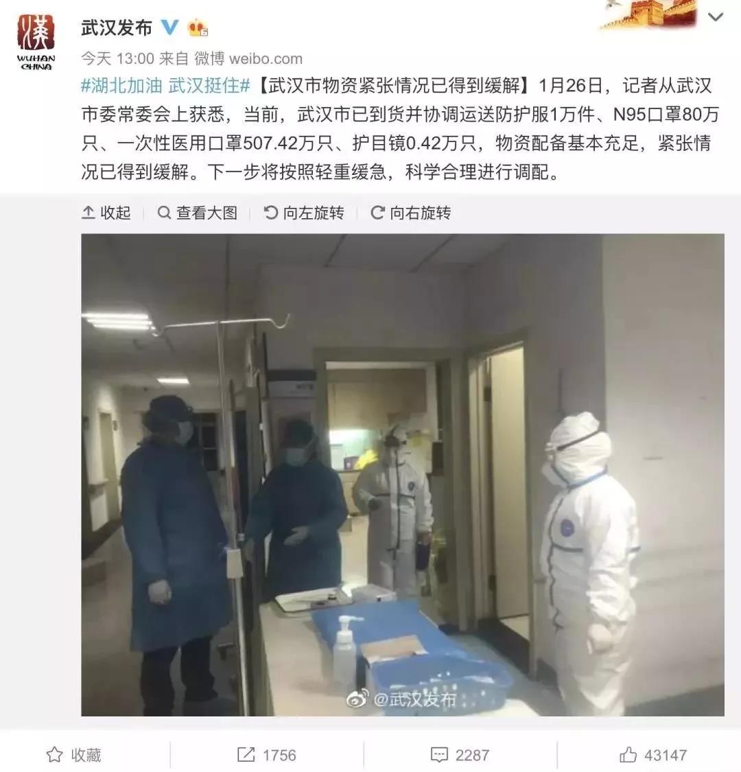 1月26日,記者從武漢市委常委會上獲悉,當前,武漢市已到貨并協(xié)調(diào)運送防護服1萬件、N95口罩80萬只、一次性醫(yī)用口罩507.42萬只、護目鏡0.42萬只,物資配備基本充足,緊張情況已得到緩解。下一步將按照輕重緩急,科學合理進行調(diào)配。