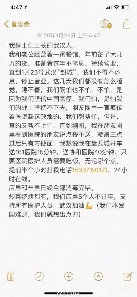 25日,武漢一餐館發(fā)帖:醫(yī)護人員需要吃飯,提前半小時打電話,24小時在線,店、車已全消毒。