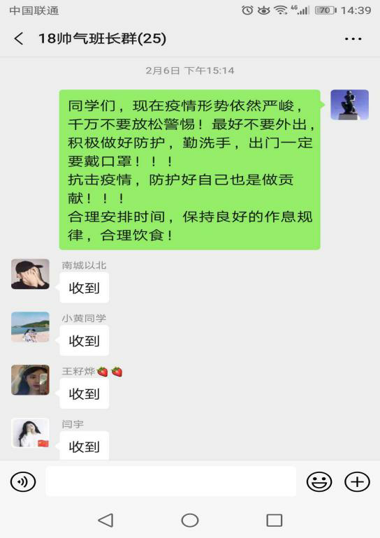 嚴(yán)峻的疫情形勢(shì)牽動(dòng)著每一個(gè)中國(guó)人的心弦,守護(hù)生命健康的白衣天使勇敢沖在防疫一線;我們最可愛(ài)的人民子弟兵也勇于承擔(dān)起神圣的使命和責(zé)任,奮戰(zhàn)在祖國(guó)需要他們的地方;社會(huì)各界人士凝聚力量,匯成抗擊疫情的一股股暖流。商學(xué)院全體輔導(dǎo)員牽掛著每一名光電學(xué)子,在學(xué)院黨委的領(lǐng)導(dǎo)和指導(dǎo)下,及時(shí)關(guān)注所有學(xué)生動(dòng)態(tài),開(kāi)展積極的思想引導(dǎo)工作。
