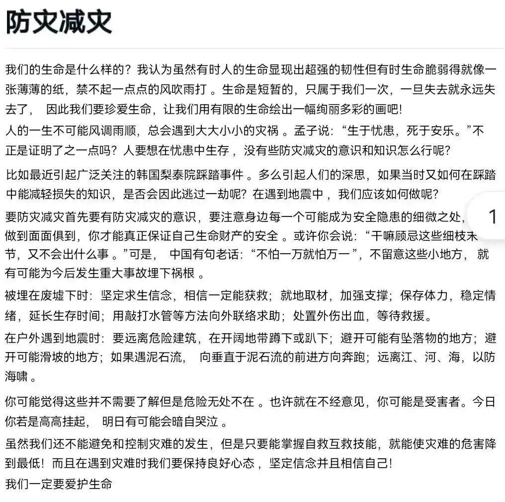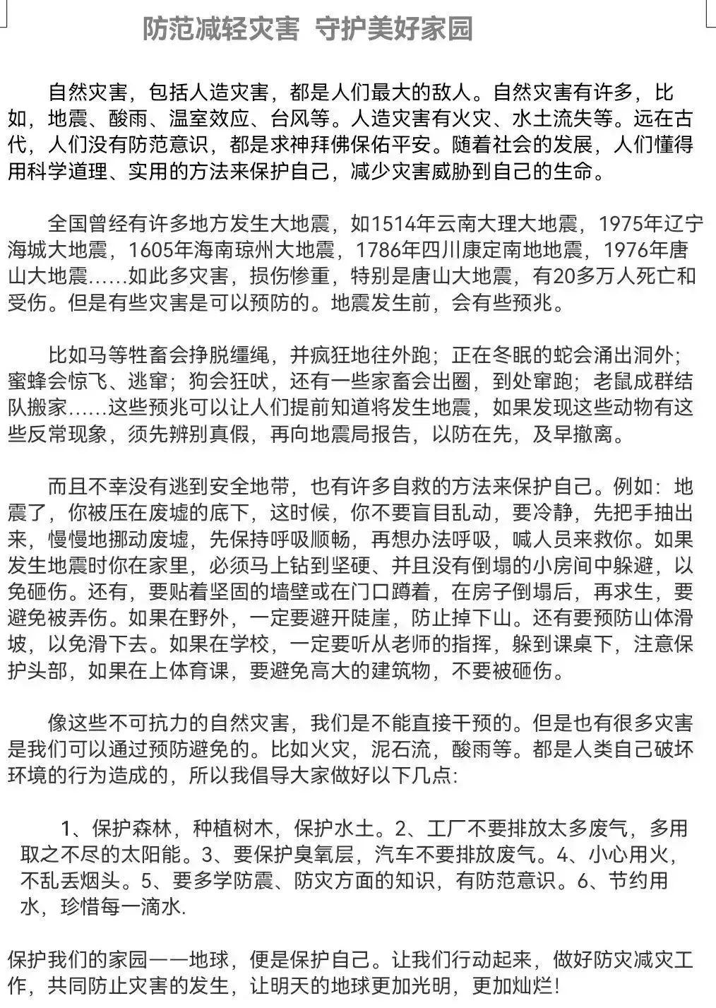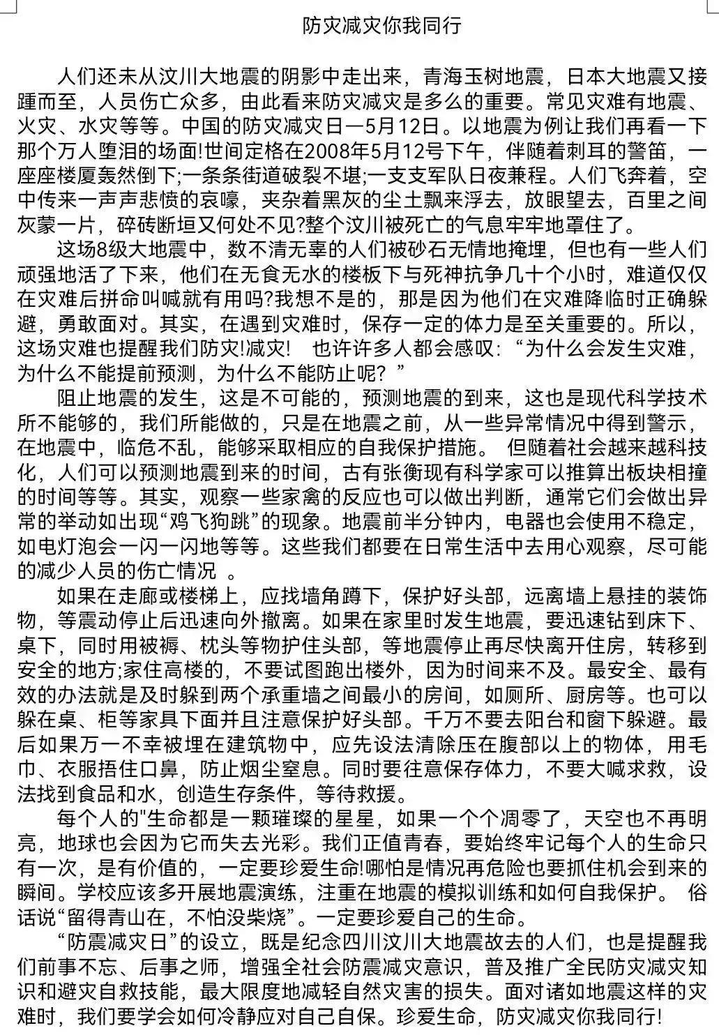 通過本次征文活動,讓同學(xué)們更加了解防災(zāi)減災(zāi)重要性, 提高安全意識,掌握更多的應(yīng)急避險和自救互救技巧。對危難時刻的急救與救人有了一定的了解,對生命也有了全新的詮釋。
