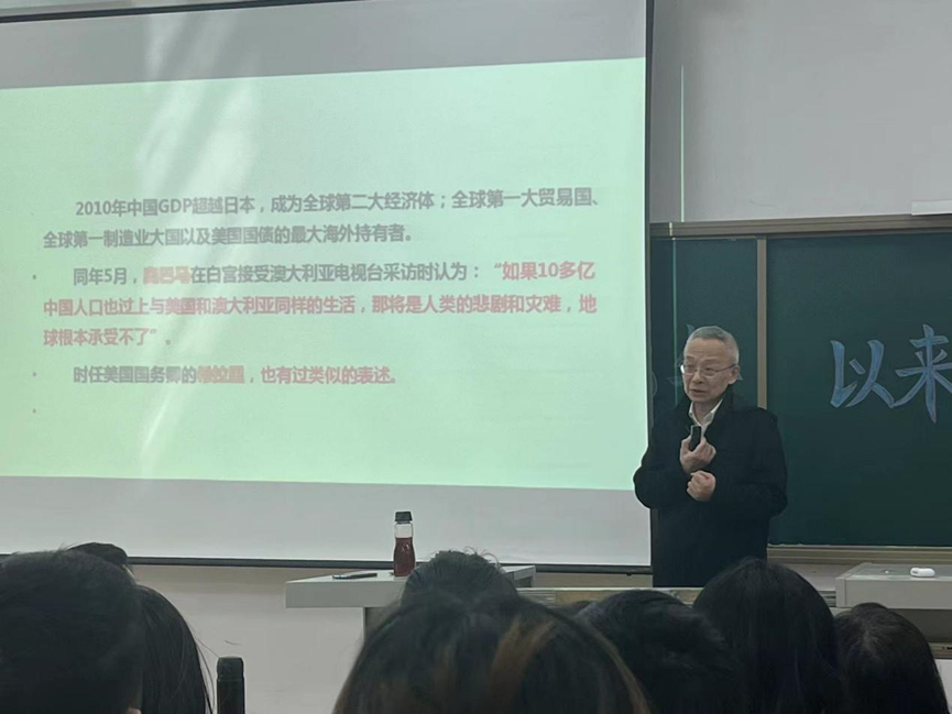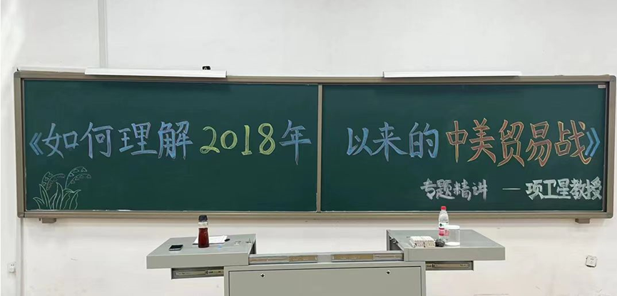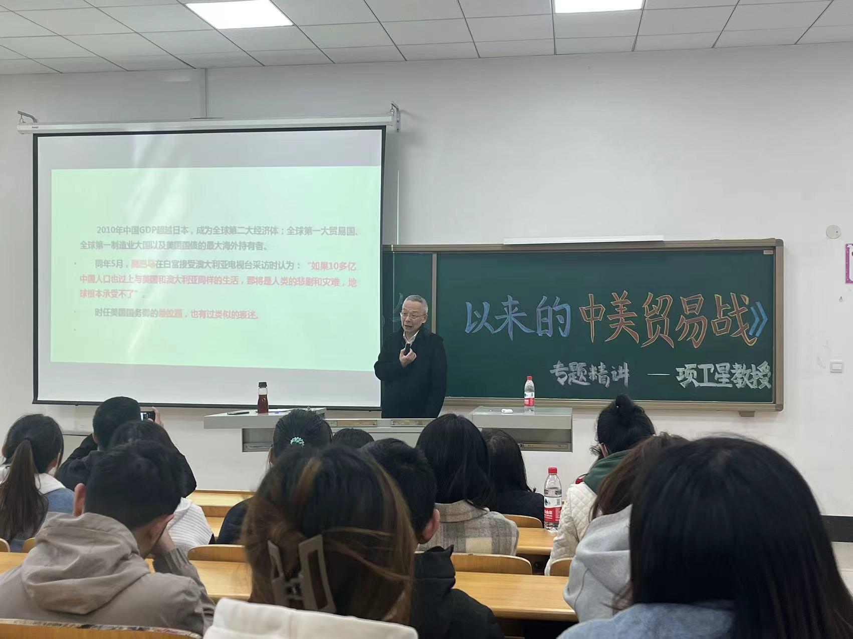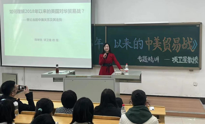 為提升國際經(jīng)濟與貿(mào)易專業(yè)學生們的專業(yè)認識,拓寬學生們的學科知識視野,2023年4月12日下午,商學院國際經(jīng)濟與貿(mào)易教研室組織承辦了“如何理解2018年以來的美國對華貿(mào)易戰(zhàn)?---兼論當前中美關系及其走勢”的專題講座,特邀我院項衛(wèi)星教授作專題講座。
