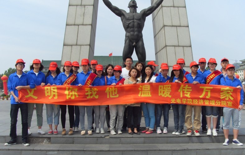 最后,為了紀(jì)念這次有意義又具有教育意義的活動,“文明你我他”公益活動的全體成員在文化廣場具有標(biāo)志性意義的金屬人像前合了影。至此,光電信息學(xué)院經(jīng)濟(jì)管理分院“文明你我他”公益活動圓滿落下帷幕。