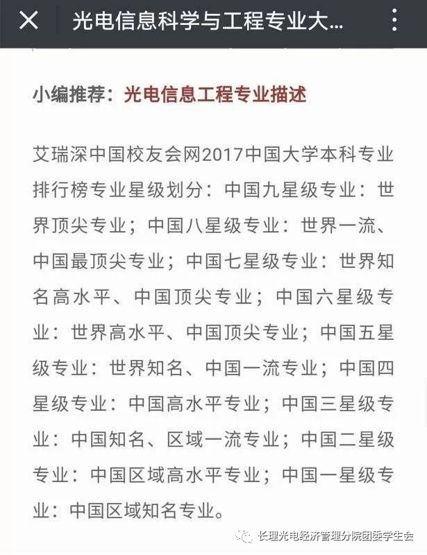 日前,根據(jù)艾瑞深中國(guó)校友會(huì)最新公布的2017中國(guó)大學(xué)本科專業(yè)排行榜,長(zhǎng)春理工大學(xué)光電信息學(xué)院(以下簡(jiǎn)稱:光電信息學(xué)院)“光電信息科學(xué)與工程專業(yè)”屬于世界高水平、中國(guó)頂尖專業(yè),專業(yè)星級(jí)6星,位列全國(guó)獨(dú)立院校專業(yè)榜首。.