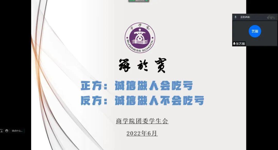在這疫情防控期間,我們的線下活動(dòng)少之又少,為豐富學(xué)生校園文化,充實(shí)校園生活,活躍學(xué)術(shù)氣氛,開(kāi)拓思想,創(chuàng)建“知誠(chéng)信、講誠(chéng)信”的誠(chéng)信校園文化氛圍,開(kāi)展有益于本院學(xué)生成長(zhǎng)的院級(jí)辯論賽,展現(xiàn)當(dāng)代大學(xué)生的風(fēng)采。