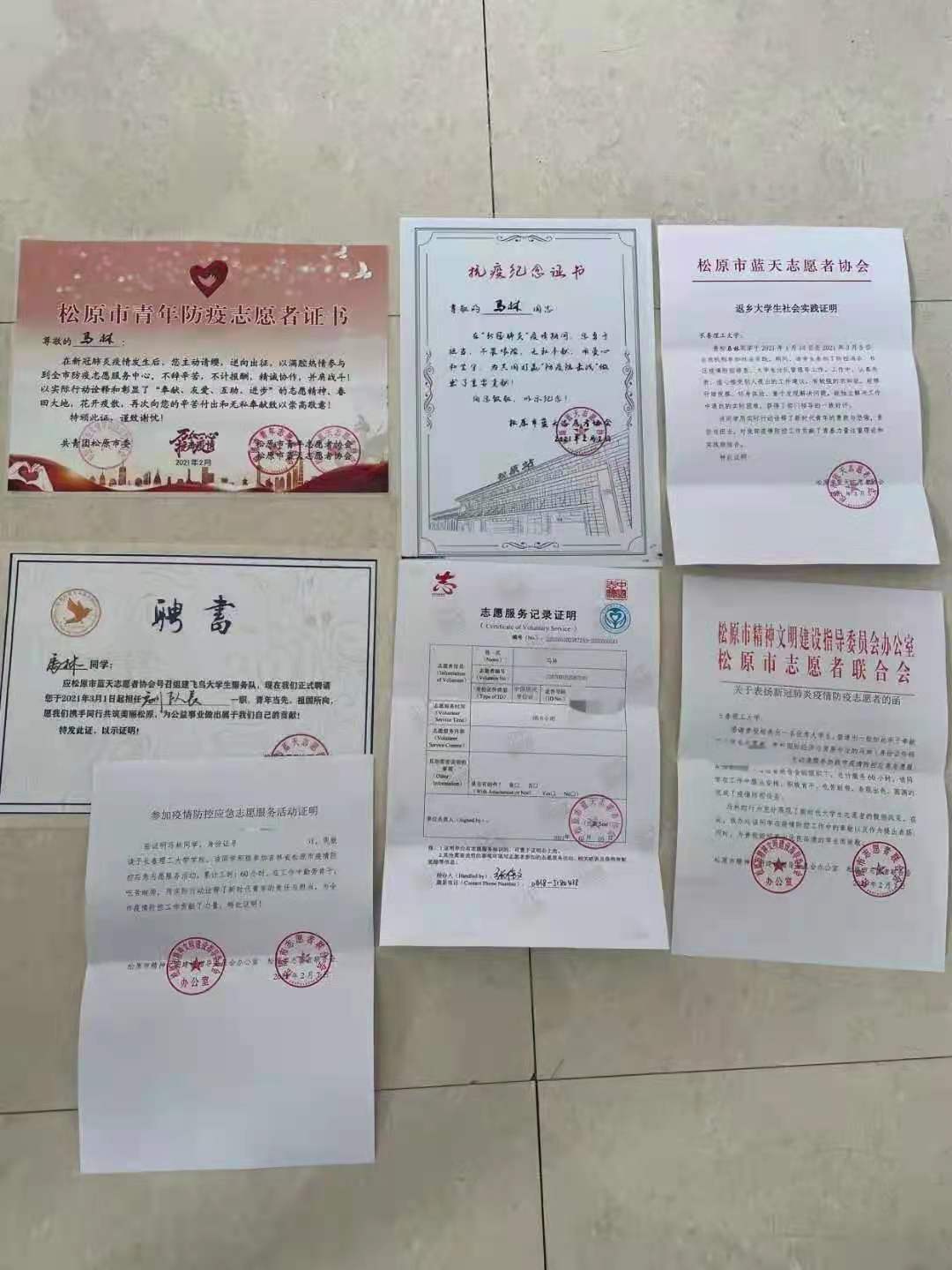 2021年2月4日,參加松原市藍(lán)天志愿者協(xié)會(huì)組織大學(xué)生火車站消殺活動(dòng)和壹基金安全家園公益3小時(shí)活動(dòng),活動(dòng)內(nèi)容為零死角、無(wú)盲區(qū)的開(kāi)展消殺作業(yè),為的是確保居民生命安全健康。他說(shuō):“疫情就是命令,防控就是責(zé)任,我是青年志愿者,莫負(fù)韶華,與國(guó)共振。”